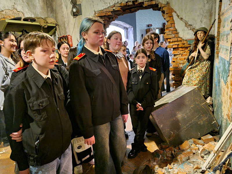 Кадеты осмотрели экспозицию «Подвиг народа», где с помощью трехмерных панорам увидели Брестскую крепость 1941 года. Оборона Брестской крепости, начавшаяся в июне 1941 года, стала одной из самых героических страниц начала Великой Отечественной войны. Именно здесь впервые всему миру был продемонстрирован героизм и бесстрашие советского народа перед врагом. Гостям показали библиотеку блокадного Ленинграда. Блокада города длилась 872 дня, началась она 8 сентября 1941 года и продлилась до 27 января 1944 года. За это время часть населения погибла при артобстрелах и от бомбардировок, а часть – от голода. Собравшиеся побывали на заводах и в госпиталях тех лет, прошли по улицам военной Москвы, побывали в кабинете Сталина и увидели секретное заседание Комитета обороны. Ребята послушали сводки Совинформбюро из студии, в которой работал знаменитый советский диктор и голос Победы Юрий Левитан. Именно он объявлял советскому народу о начале войны, о взятии Берлина и о Победе над врагом.