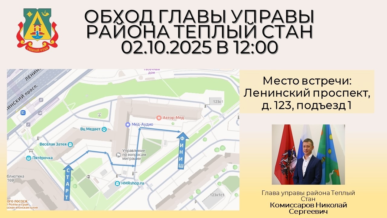 02 октября 2025 года в 12:00 состоится обход территории главой управы района Теплый Стан Николая Сергеевича Комиссарова