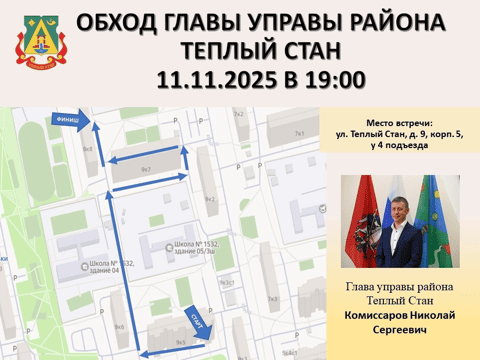 11 ноября, в 19:00, состоится обход территории с главой управы Теплого Стана Николаем Сергеевичем Комиссаровым.
