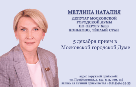 В эту пятницу, 5 декабря 2025 г., личный прием граждан в Московской городской Думе проведет депутат Наталия Метлина.