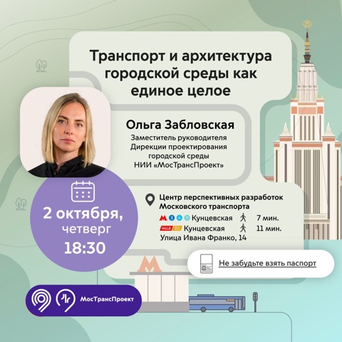 Спикером выступит Ольга Забловская, заместитель руководителя Дирекции проектирования городской среды НИИ «МосТрансПроект». На познавательной встрече: