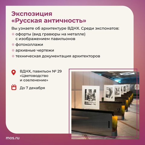 Вы узнаете об архитектуре ВДНХ, полюбуетесь пейзажами, портретами, натюрмортами и фарфоровыми изделиями.