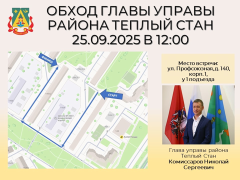 25 сентября 2025 года в 12:00 состоится обход территории главой управы района Теплый Стан Николая Сергеевича Комиссарова.