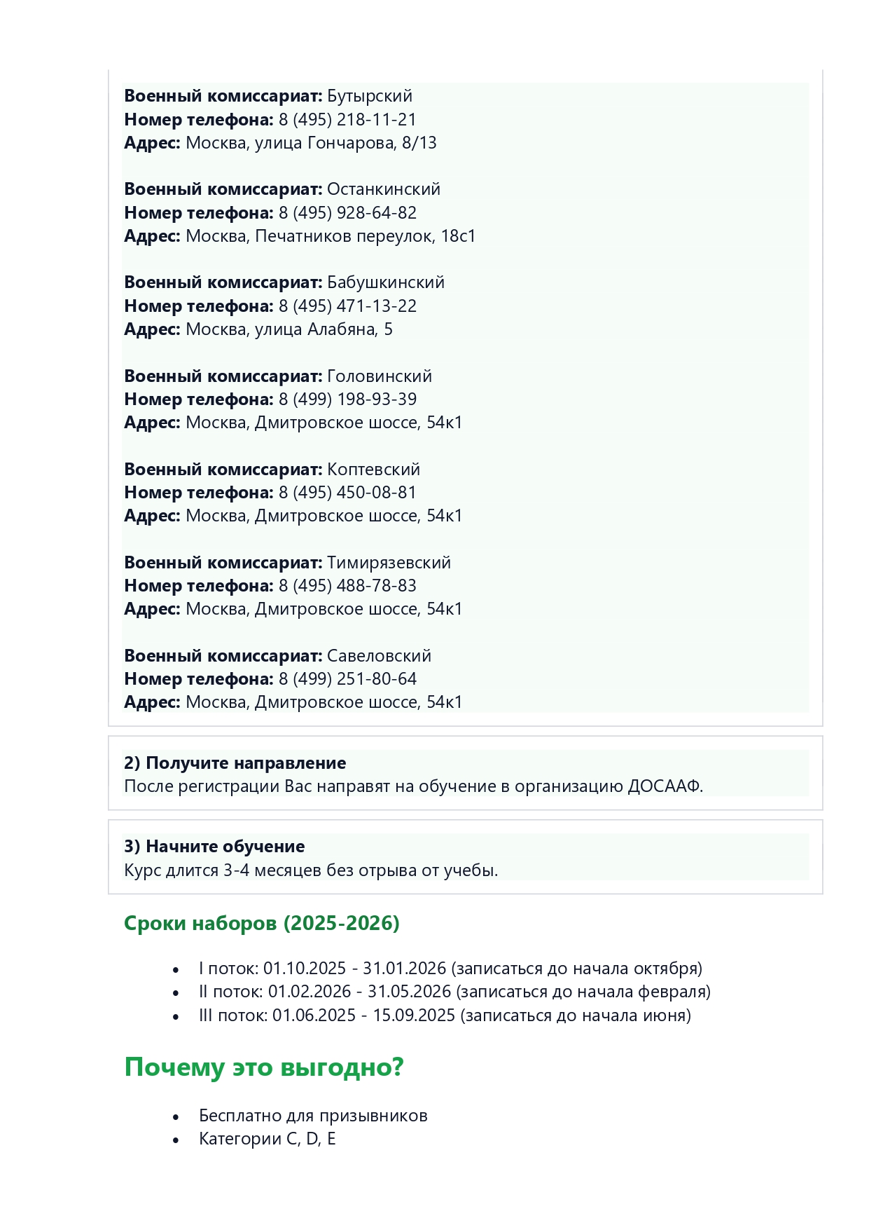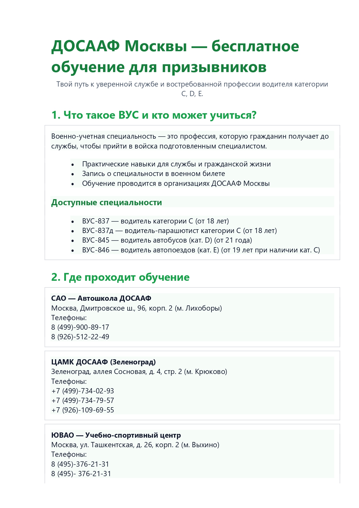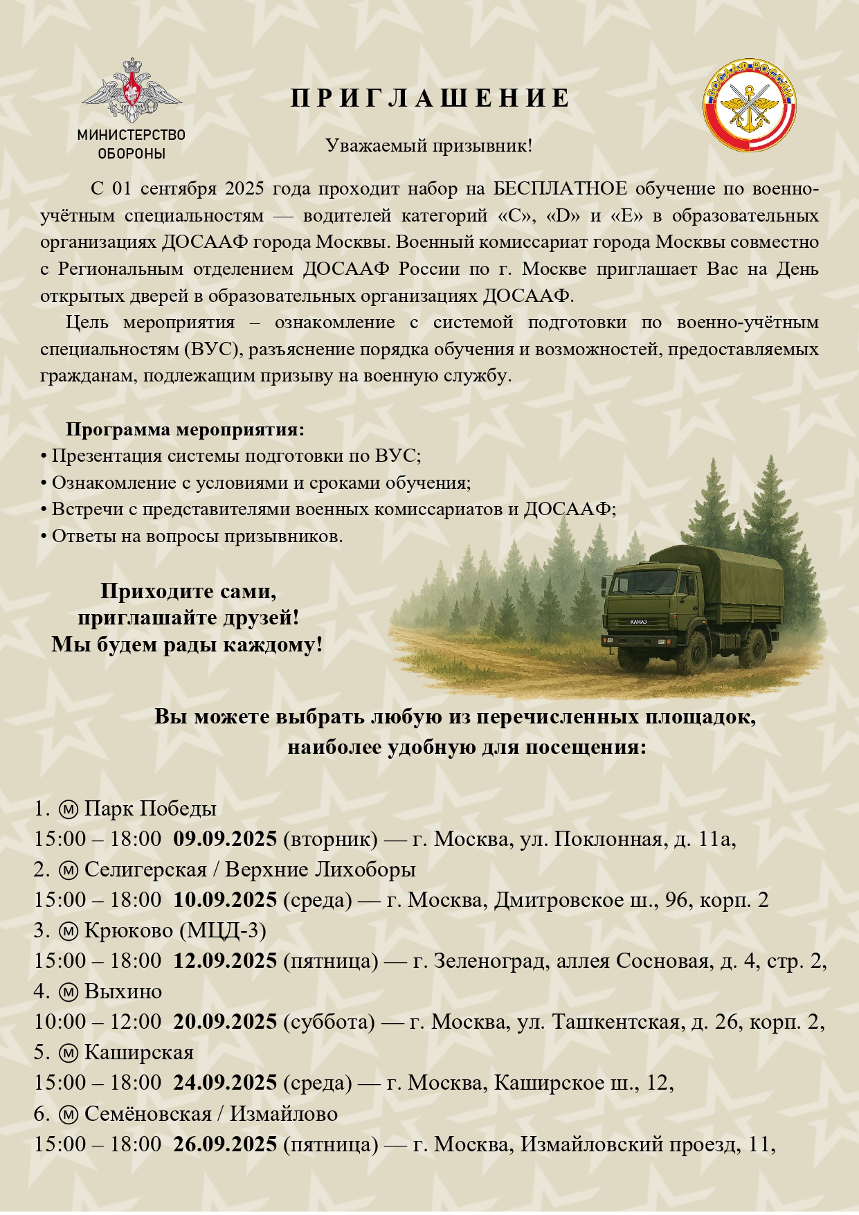 С 01 сентября 2025 года проходит набор на БЕСПЛАТНОЕ обучение по военно-учётным специальностям — водителей категорий «С», «D» и «E» в образовательных организациях ДОСААФ города Москвы