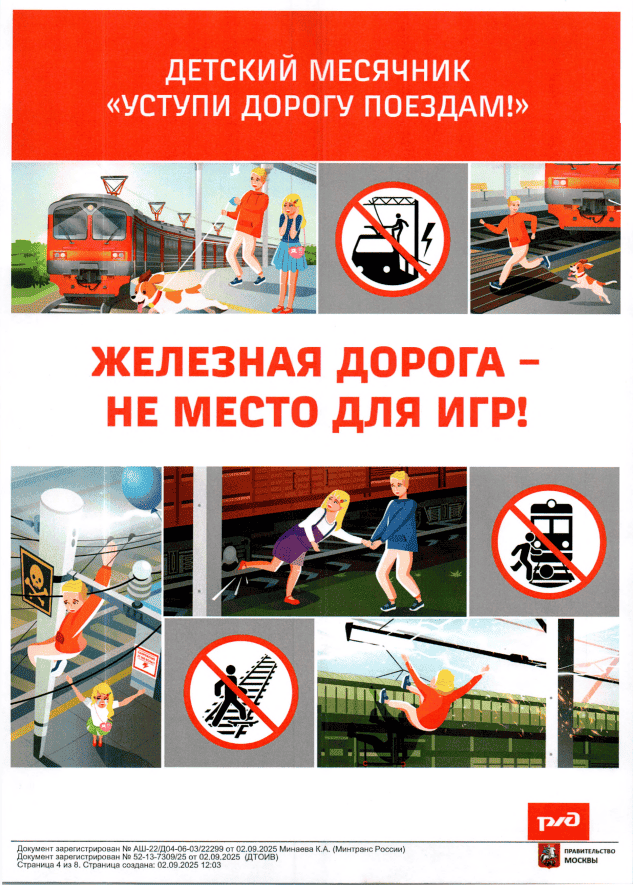 В период с 1 по 30 сентября 2025 г. запланировано проведение детского месячника «Уступи дорогу поездам!», направленного на формирование у несовершеннолетних граждан культуры безопасного поведения на объектах железнодорожного транспорта.